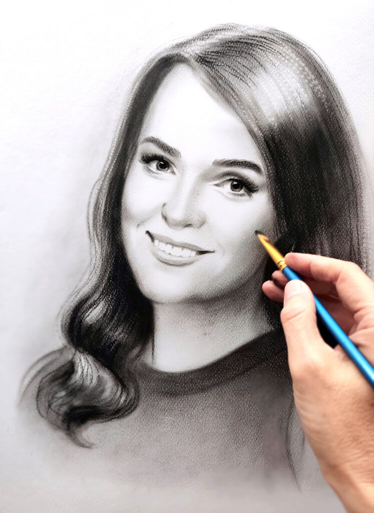 Когда портрет готов, я могу предложить оформление (например, раму с паспарту под стеклом для чёрно-белых работ и пастели).